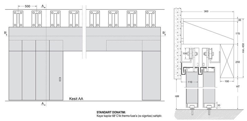 - Kayar kapı REI 120'ye max. 1310x2250 mm (dış kasa) boyutlarında personel kapı uygulanabilir